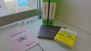 熊本県の高校のパンフや昨年の高校入試の情報冊子(ウィルオリジナルのスペシャルなやつです♪)、パソコンをおいています!